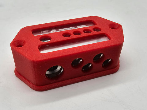 Cased distribution blocks with 1 4 gauge input and 4 8 gauge outputs, CNC machined from 6061 aluminum, sold in 14 colors and includes stainless hardware.